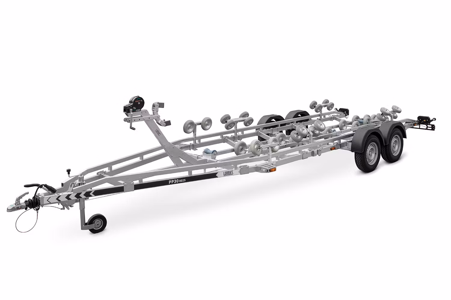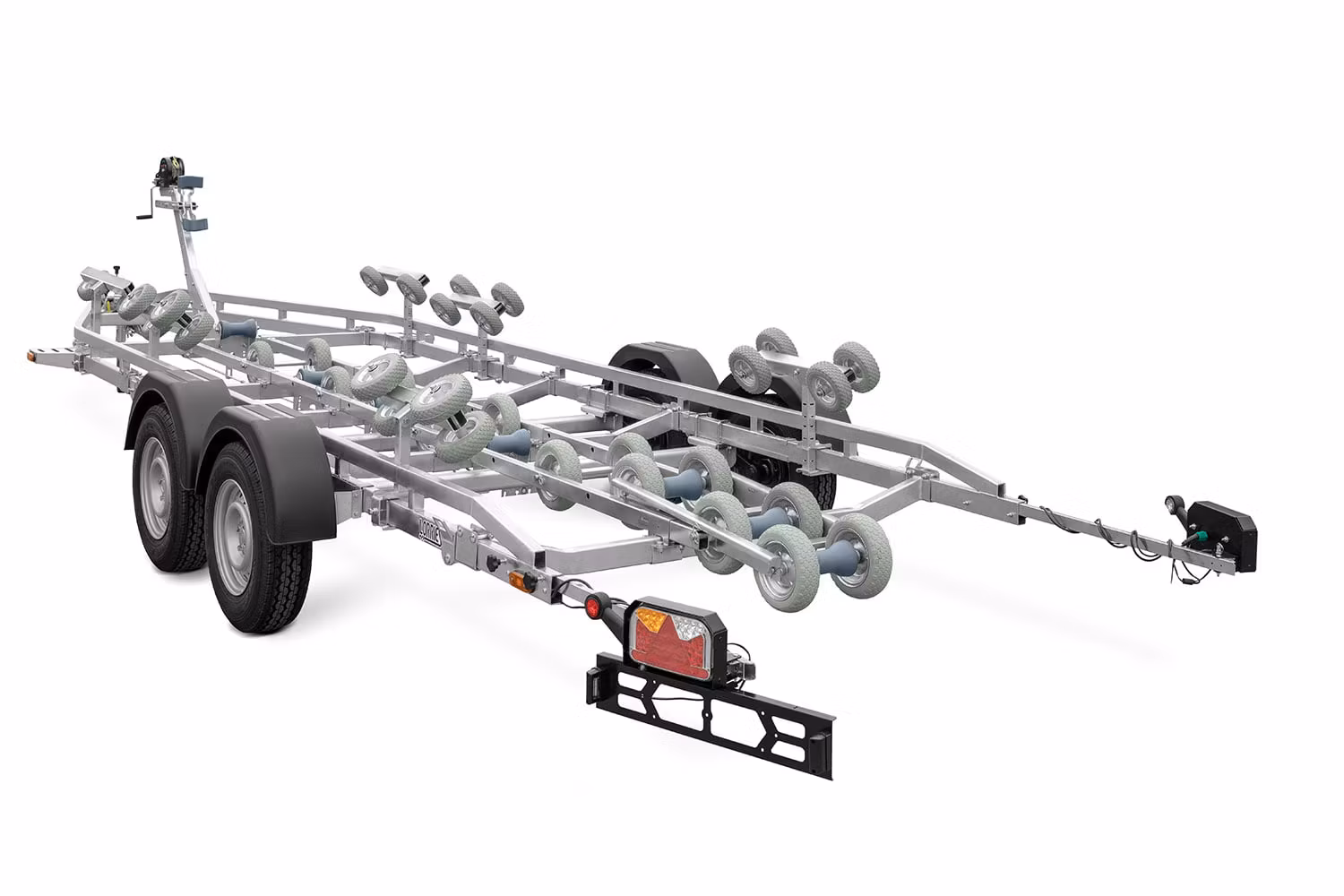 Dessutom har den här modellen möjlighet att justera släpvagnens längd genom ett system med förlängning av bakre lampor med ytterligare 0,9 meter. Med detta kan vi justera längden på den transporterade båten från 6,5 till 7,4 meter. För att säkerställa båtens stabilitet är släpvagnen utrustad med ett axelrörelsessystem – glidaxel, vilket möjliggör val av en bättre tyngdpunkt för den last som transporteras.