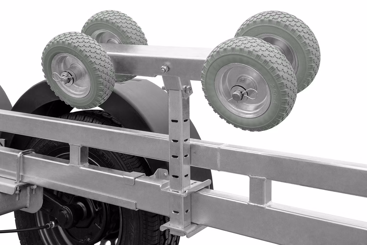 Släpvagnskonstruktionen är svetsad av stålprofiler, med ytterligare ramarmering, vilket garanterar släpvagnens stabilitet och hållbarhet. Med detta kommer varje båt att vara säker under transport. Släpvagnens stålelement genomgår en varmförzinkningsprocess, med vilken stålet får en skyddande beläggning som stärker den mot mekanisk skada och korrosion. Därför kan den lätt stå i regnet eller komma ut i vattnet.